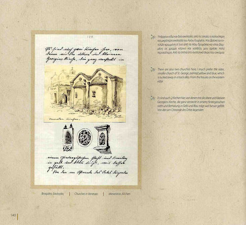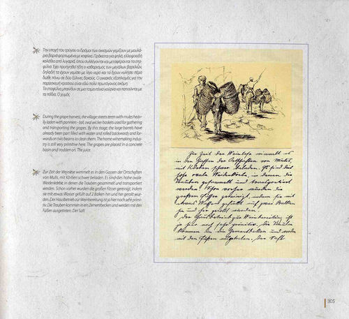 «[…] και το πρωί στις 7, στις 31 Ιανουαρίου, ξεκινήσαμε πάλι για να πάμε από την ενδοχώρα και τα βουνά στη νότια ακτή. Η διαδρομή ήταν με μια λέξη υπέροχη. Ψηλά χιονοσκέπαστα βουνά, που άστραφταν στο φως του ήλιου, απότομες πλαγιές που διέτρεχε ο αμαξιτός δρόμος με αμέτρητες στροφές. Η διαδρομή, άλλοτε ανηφορική και άλλοτε κατηφορική, διασχίζει ορεινά περάσματα, οικισμούς εύφορες κοιλάδες, προσπερνά κέδρους, κυπαρίσσια, ελιές, μέχρι να φανεί πάλι στο βάθος η λαμπερή θάλασσα και μες στην καταχνιά το περίγραμμα των νησιών Παξιμάδια.»