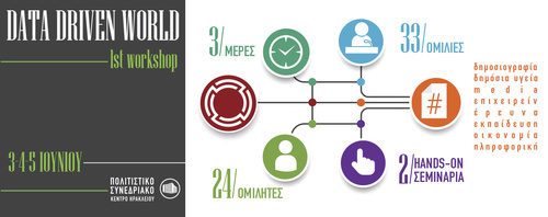Το 1ο Workshop “Data Driven World”, έχει στόχο να φέρει σε επαφή ανθρώπους από τα media, τη δημοσιογραφία, την εκπαίδευση, τη δημόσια υγεία, τους δημόσιους οργανισμούς, τις επιχειρήσεις και την πολιτική, με τον κόσμο των Δεδομένων.