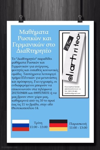 Το «ΔιαRτηρητέο» παραδίδει μαθήματα Ρωσικών (κάθε Τρίτη 11.00-13.00) και Γερμανικών (κάθε Παρασκευή 11.00-13.00) για ανέργους , φοιτητές και ευπαθείς κοινωνικές ομάδες. Ταυτόχρονα λειτουργεί τμήμα Ελληνικών για μετανάστες και πρόσφυγες. Για εγγραφές , οι ενδιαφερόμενοι μπορούν να επικοινωνούν στα τηλέφωνα 2815109406 και 6995150031 ή να μας βρουν στον χώρο μας καθημερινά 10.00 με 14.00 και 17.00-21.00 στην οδό Θεοτοκοπούλου 14.