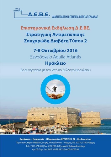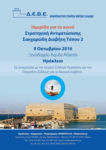 Η Διαβητολογική Εταιρεία Βόρειας Ελλάδας διοργανώνει Ημερίδα Ενημέρωσης για το κοινό σε συνεργασία με τον Ιατρικό Σύλλογο Ηρακλείου και τον Παγκρήτιο Σύλλογο για τον Νεανικό Διαβήτη, στο Ηράκλειο με θέμα: «Στρατηγική Αντιμετώπισης Σακχαρώδη Διαβήτη Τύπου 2» στο πλαίσιο ενημέρωσης και εκπαίδευσης ατόμων με Σακχαρώδη Διαβήτη.