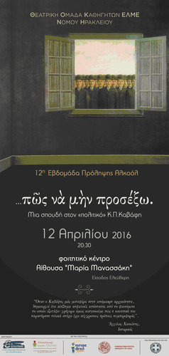 Με το φωνητικό σύνολο Quarto Accademmico του Σύγχρονου Ωδείου Κρήτης στις 20.30-21.00 και Δραματοποιημένη ποίηση Καβάφη από τη Θ.Ο.Κ.Ν.Η. στις 21.00-22.00 Με το φωνητικό σύνολο Quarto Accademmico του Σύγχρονου Ωδείου Κρήτης στις 20.30-21.00 και Δραματοποιημένη ποίηση Καβάφη από τη Θ.Ο.Κ.Ν.Η. στις 21.00-22.00 συνεχίζονται σήμερα Τρίτη σήμερα Τρίτη στο Αμφιθέατρο Μαρία Μανασσάκη, στο Φοιτητικό Κέντρο του Πανεπιστημίου Κρήτης στις Βούτες στο Ηράκλειο, οι εκδηλώσεις της 12ης Εβδομάδας Πρόληψης Αλκοόλ, με κεντρικό μήνυμα: