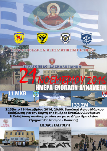 α. Σάββατο 19 Νοεμβρίου 2016 και ώρα 20:00 στην Βασιλική Αγίου Μάρκου, εορταστική εκδήλωση, η οποία θα περιλαμβάνει ομιλίες-παρουσιάσεις οπτικοακουστικού υλικού με θέμα τις Ένοπλες Δυνάμεις καθώς και μουσικό πρόγραμμα με τη συμμετοχή της Φιλαρμονικής του Δήμου Ηρακλείου.Η είσοδος θα είναι ελεύθερη για το κοινό.