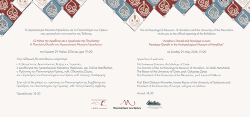 Το Αρχαιολογικό Μουσείο Ηρακλείου, στο πλαίσιο δράσεων σύνδεσης του Μουσείου με την τοπική κοινωνία, συνδιοργανώνει με το Πανεπιστήμιο των Ορέων Έκθεση με θέμα «Ο Μίτος της Αριάδνης και ο Αργαλειός της Πηνελόπης. Η Πηνελόπη Gandhi στο Αρχαιολογικό Μουσείο Ηρακλείου».
