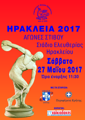 Με την στήριξη της Περιφέρειας Κρήτης, του ΣΕΓΑΣ Κρήτης, του Δ.Ο.Π.Α.Φ.Μ.Α.Η. και του Εθνικού Αθλητικού Κέντρου Ηρακλείου, θα πραγματοποιηθούν οι αγώνες στίβου «ΗΡΑΚΛΕΙΑ 2017» που οργανώνει η Γυμναστική Ένωση Ηρακλείου (ΓΕΗ) το Σάββατο 27 Μαΐου 2017 στο στάδιο «Ελευθερίας» (Ηράκλειο) με ώρα έναρξης στις 11:30 το πρωί.
