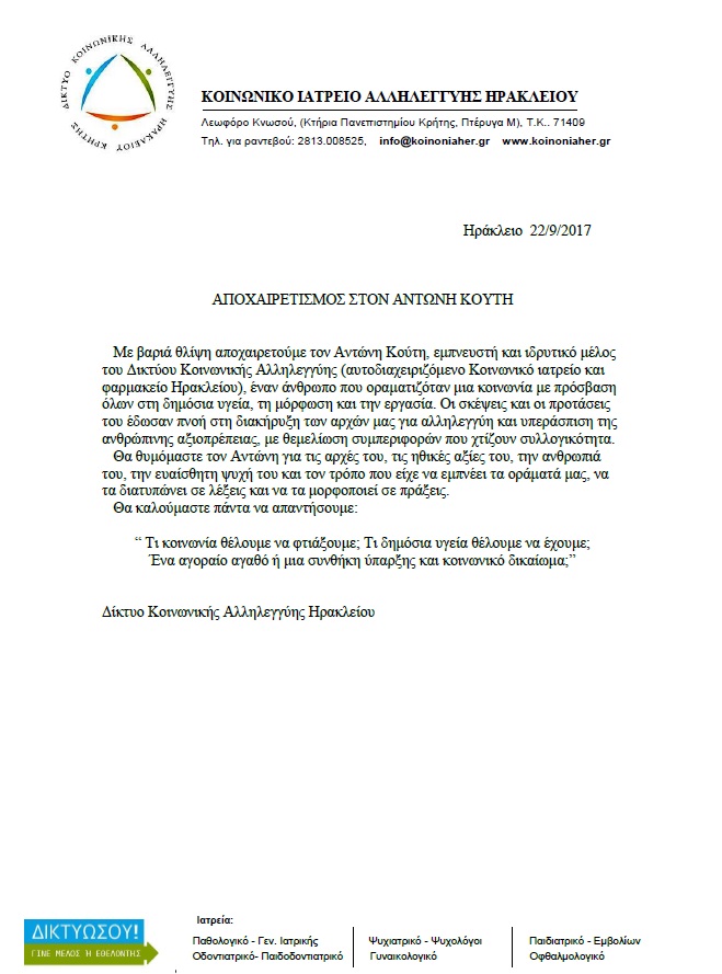 Αποχαιρετισμός του δικτύου Κοινωνικής Αλληλεγγύης Ηρακλείου στον Αντώνη Κούτη.