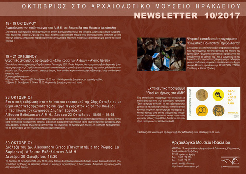 Τη Δευτέρα, 30 Οκτωβρίου 2017, στις 18:30, στην Αίθουσα Εκδηλώσεων θα δοθεί διάλεξη του Δρ. Alessandro Greco (Πανεπιστήμιο της Ρώμης, La Sapienza) με θέμα «Η κυριαρχία της αισθητικής: η βιοτεχνία και η διαχείριση της υψηλής μόδας στη Μυκηναϊκή Κρήτη».