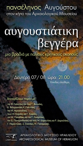 Το Αρχαιολογικό Μουσείο Ηρακλείου σας προσκαλεί στην αυλή του, την ημέρα της αυγουστιάτικης πανσελήνου, για να βεγγερίσουμε. Η «Αυγουστιάτικη Βεγγέρα» στον κήπο τον μουσείου είναι αφιερωμένη στην κρητική μουσική παράδοση. Το ολόγιομο φεγγάρι θα ακούσει ξανά τις φωνές του Ερωτόκριτου, και των ερωτικών μαντινάδων, τις αντηχήσεις των πνευστών οργάνων σε σκοπούς της κεντρικής και της ανατολικής Κρήτης, τις κοντυλιές του Καλογερίδη και άλλες βιαννίτικες κοντυλιές με μαντολίνο, συνθέτοντας μια ολοκληρωμένη καντάδα από εκείνες που ξυπνούν το γιασεμί.