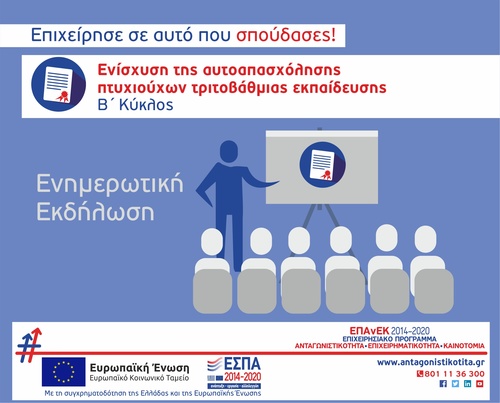 «ΕΝΙΣΧΥΣΗ ΤΗΣ ΑΥΤΟΑΠΑΣΧΟΛΗΣΗΣ ΠΤΥΧΙΟΥΧΩΝ ΤΡΙΤΟΒΑΘΜΙΑΣ ΕΚΠΑΙΔΕΥΣΗΣ – Β΄ ΚΥΚΛΟΣ» & «ΕΝΙΣΧΥΣΗ ΤΗΣ ΙΔΡΥΣΗΣ ΚΑΙ ΛΕΙΤΟΥΡΓΙΑΣ ΝΕΩΝ ΤΟΥΡΙΣΤΙΚΩΝ ΚΑΙ ΜΙΚΡΟΜΕΣΑΙΩΝ ΕΠΙΧΕΙΡΗΣΕΩΝ»