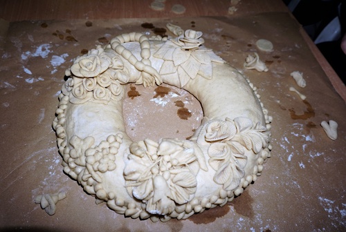Στα πλαίσια των παράλληλων εκδηλώσεων η εθνική αρτοποιών τη Δευτέρα δημιούργησε το ξομπλιαστό κουλούρι γάμου της Κρήτης με όλα τα “πλουμίδια” του που παραπέμπουν σε συμβολισμούς που ανέλυσε η κ.Δέσποινα Μαθιουδάκη.