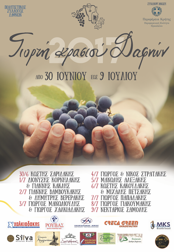 Με την συνδιοργάνωση της Περιφέρειας Κρήτης-ΠΕ Ηρακλείου ο πολιτιστικός σύλλογος Δαφνών οργανώνει τη 42η γιορτή «Κρασιού Δαφνών» από 30 Ιουνίου εως 9 Ιουλίου 2017 με ελεύθερη είσοδο.