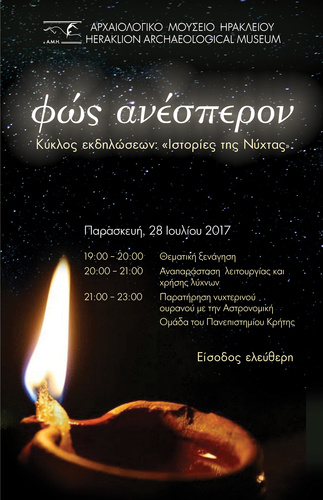 Το Αρχαιολογικό Μουσείο Ηρακλείου, συμμετέχοντας στις «Ιστορίες της Νύχτας» του Υπουργείου Πολιτισμού και Αθλητισμού, σας προσκαλεί στην εκδήλωση με τον τίτλο «Φως ανέσπερον», την Παρασκευή 28 Ιουλίου 2017. Η εκδήλωση περιλαμβάνει τις ακόλουθες πράξεις: