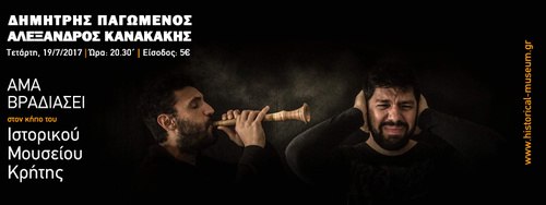 Με τη μουσική παρουσία των Δημήτρη Παγωμένου και Αλέξανδρου Κανακάκη, σήμερα, Τετάρτη, 19 Ιουλίου, ώρα 20.30΄, συνεχίζεται ο κύκλος καλοκαιρινών εκδηλώσεων Άμα βραδιάσει, στον κήπο του Ιστορικού Μουσείου Κρήτης.