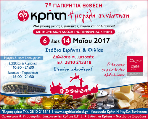 Μετά τη μεγάλη επιτυχία που σημείωσαν οι προηγούμενες διοργανώσεις της Παγκρήτιας έκθεσης “ΚΡΗΤΗ: Η Μεγάλη Συνάντηση” και της θερμής υποδοχής που τους επιφύλαξε το κοινό της Αθήνας και της Θεσσαλονίκης, ορίστηκε ο χρόνος διεξαγωγής της 7ης διοργάνωσης, που θα πραγματοποιηθεί για εννέα πλέον ημέρες και συγκεκριμένα από το Σάββατο 6 Μαΐου έως και την Κυριακή 14 Μαΐου 2017 στο Στάδιο Ειρήνης & Φιλίας στο Νέο Φάληρο.