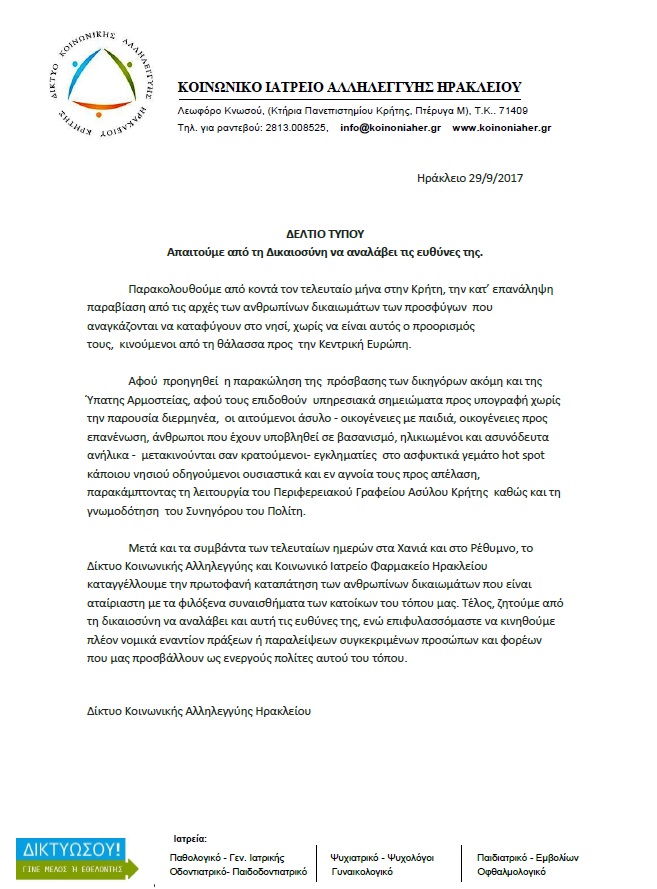 Έκκληση προς την δικαιοσύνη για τις παραβιάσεις των δικαιωμάτων των προσφύγων στην Κρήτη
