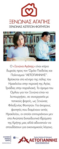 Η προσπάθεια για την ολοκλήρωση του οράματος του νέου Ξενώνα δεν σταματά ποτέ. Οπότε γίνεται έκκληση σε ευαισθητοποιημένους Εθελοντές όλων των ειδικοτήτων (Μηχανικούς, Τεχνικούς, Τεχνίτες, Κοινωνικούς Επιστήμονες & Λειτουργούς, Δημοσιογράφους, υπεύθυνους εύρεσης χορηγιών κλπ) να συνδράμουν με τον τρόπο τους σε αυτήν την προσπάθεια. Μπορούν να έρθουν σε επαφή με τον Ξενώνα και τον Όμιλο στα κεντρικά του Ομίλου, Έβανς & Πλαστήρα γωνία, στο www.Aetogiannis.gr , στο Aetogiannis.external.relations@gmail.com και στα τηλέφωνα: 2810333333 , 6955.10.33.10