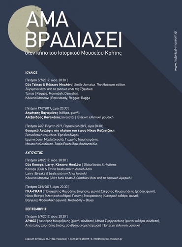 Ηχοχρώματα από πολλές και διαφορετικές μουσικές κουλτούρες, νυχτερινές περιηγήσεις στις Συλλογές του Ιστορικού Μουσείου Κρήτης και μια ιδιαίτερη θεατρική πρόταση στο πλαίσιο του έτους Ν. Καζαντζάκη, συνθέτουν το πρόγραμμα καλοκαιρινών εκδηλώσεων του ΙΜΚ, που δίνει και φέτος βήμα σε μουσικά σχήματα, τραγουδοποιούς και νέους καλλιτέχνες, από την αθηναϊκή και την τοπική σκηνή, Άμα βραδιάσει, στον κήπο του Ιστορικού Μουσείου Κρήτης.