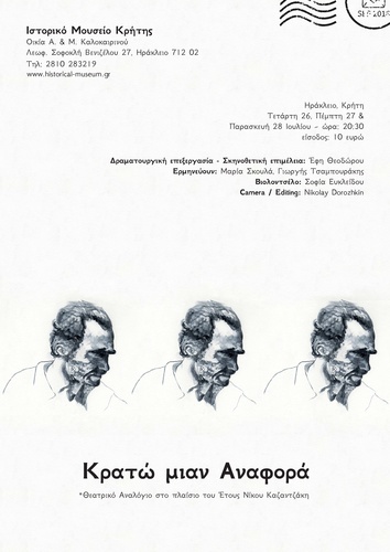 Η Εταιρία Κρητικών Ιστορικών Μελετών, σε συνέχεια της γόνιμης και επι σειράς ετών ενασχόλησής της με τη μορφή και το έργο του Νίκου Καζαντζάκη, οργανώνει, στο πλαίσιο του έτους προς τιμήν του σπουδαίου Έλληνα συγγραφέα, για τρεις αλλεπάλληλες βραδιές, Τετάρτη 26, Πέμπτη 27 και Παρασκευή 28 Ιουλίου, ώρα 20.30΄, την παράσταση θεατρικού αναλογίου Κρατώ μιαν Αναφορά, που επιμελήθηκε ειδικά για το Ιστορικό Μουσείο Κρήτης η αναγνωρισμένη σκηνοθέτις Έφη Θεοδώρου.