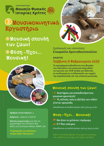 Το Μουσείο Φυσικής Ιστορίας Κρήτης – Πανεπιστήμιο Κρήτης εγκαινιάζει 2 μουσικοκινητικά εργαστήρια, «Φύση-Ήχοι... Μουσική!» και «Μουσική σπουδή των ζώων!» της Σταυρούλας Χριστοδουλοπούλου, τα οποία υπόσχονται μοναδικές ηχο-δράσεις στα μεσογειακά οικοσυστήματα του Μουσείου!