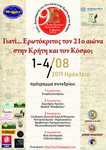 Το Παγκόσμιο Συμβούλιο Κρητών και η Περιφέρεια Κρήτης σας προσκαλούν στο 9ο Συνέδριο του Παγκοσμίου Συμβουλίου Κρητών από την 1 η έως τις 4 Αυγούστου 2019, στο Πολιτιστικό Κέντρο του Δήμου Ηρακλείου. Η έναρξη των εργασιών πραγματοποιείται την Πέμπτη 1 Αυγούστου και ώρα 18:00 με επιμνημόσυνη δέηση στον τάφο του Νίκου Καζαντζάκη (Προμαχώνας Μαρτινέγκο) και η καταληκτήρια τελετή στο χωριό Κρουσώνας.