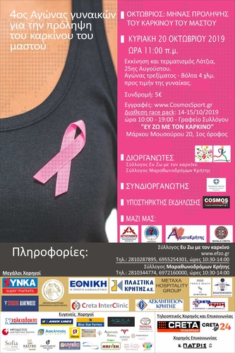 Ο Σύλλογος στήριξης ασθενών με νεοπλασματική νόσο «Ευ Ζω με τον Καρκίνο», σε συνεργασία με το Σύλλογο Μαραθωνοδρόμων Κρήτης, την στήριξη της Περιφέρειας Κρήτης- Περιφερειακή Ενότητα Ηρακλείου και τα Cosmos Sport θα πραγματοποιήσει και φέτος για 4η συνεχή χρονιά, στις 20 Οκτωβρίου, ημέρα Κυριακή και ώρα 11π.μ., Αγώνα Γυναικών για την πρόληψη του καρκίνου του μαστού.