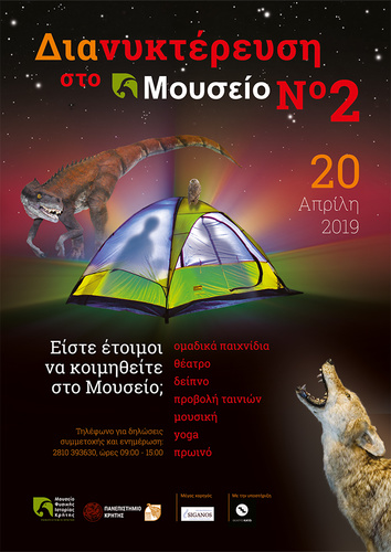 Το Μουσείο Φυσικής Ιστορίας Κρήτης χαιρετίζει την άνοιξη με μία δεύτερη Διανυκτέρευση στο Μουσείο - Sleep Over! Το βράδυ του Σαββάτου 20 Απριλίου 2019 και ώρα 20:00 το Μουσείο Φυσικής Ιστορίας Κρήτης θα ανοίξει τις πόρτες του σε δεινούς και ατρόμητους κατασκηνωτές που δεν φοβούνται να κοιμηθούν στις κορυφές των ψηλών βουνών, πλάι σε μία σαρκοφάγο αρκούδα ή σε έναν μεσογειακό λύκο! Mία από τις πλέον σύγχρονες διεθνείς μουσειολογικές πρακτικές που γνώρισε μεγάλη απήχηση και επιτυχία όταν έγινε για πρώτη φορά στην Κρήτη τα Χριστούγεννα του 2017 από το Μουσείο Φυσικής Ιστορίας Κρήτης. Κοιμόμαστε στο Μουσείο… ξυπνάμε στη Φύση…!