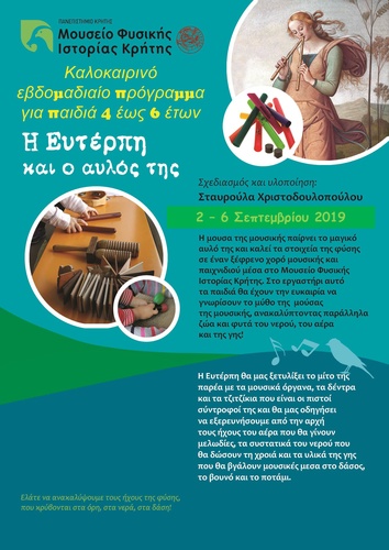 Η μούσα της μουσικής παίρνει το μαγικό αυλό της και καλεί τα στοιχεία της φύσης σε έναν ξέφρενο χορό μουσικής και παιχνιδιού μέσα στο Μουσείο Φυσικής Ιστορίας Κρήτης. Στο εργαστήρι αυτό τα παιδιά θα έχουν την ευκαιρία να γνωρίσουν το μύθο της μούσας της μουσικής, ανακαλύπτοντας παράλληλα ζώα και φυτά του νερού, του αέρα και της γης! Η Ευτέρπη ξετυλίγει τον μίτο της παρέα με τα μουσικά όργανα, τα δέντρα και τα τζιτζίκια που είναι οι πιστοί σύντροφοί της, και θα μας οδηγεί να εξερευνήσουμε από την αρχή τους ήχους του αέρα που θα γίνουν μελωδίες, τα συστατικά του νερού που θα δώσουν τη χροιά και τα υλικά της γης που θα βγάλουν μουσικές μέσα στο δάσος, το βουνό και το ποτάμι.