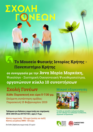 Tο Μουσείο Φυσικής Ιστορίας Κρήτης-Πανεπιστήμιο Κρήτης σε συνεργασία με την κα Άννα Μαρία Μαρκάκη, Ψυχολόγο - Συστημική Οικογενειακή Ψυχοθεραπεύτρια, συνδιοργανώνουν «Σχολή Γονέων» στον χώρο του Μουσείου, κάθε Παρασκευή στις 17:00. Επόμενη Συνάντηση Παρασκευή 15 Φεβρουαρίου 2019, ώρα 17:00