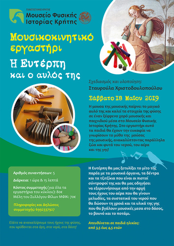 Η μούσα της μουσικής παίρνει το μαγικό αυλό της και καλεί τα στοιχεία της φύσης σε έναν ξέφρενο χορό μουσικής και παιχνιδιού μέσα στο Μουσείο Φυσικής Ιστορίας Κρήτης. Στο εργαστήρι αυτό τα παιδιά θα έχουν την ευκαιρία να γνωρίσουν το μύθο της μούσας της μουσικής, ανακαλύπτοντας παράλληλα ζώα και φυτά του νερού, του αέρα και της γης!