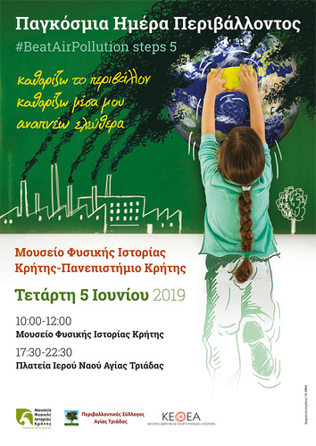 Το Μουσείο Φυσικής Ιστορίας Κρήτης σε συνεργασία με τον Περιβαλλοντικό Σύλλογο Αγίας Τριάδας και τη θεραπευτική κοινότητα ΚΕΘΕΑ Αριάδνη τιμούν την Παγκόσμια Ημέρα Περιβάλλοντος και το φετινό της μήνυμα_BeatAirPollution_ διοργανώνοντας παράλληλες δράσεις σε δύο σημεία της πόλης, στον Κόλπο του Δερματά και στην πλατεία Ιερού Ναού της Αγίας Τριάδας.