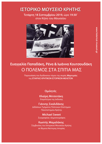 Στις εμπειρίες και τις μνήμες των «αμάχων» –παιδιών και γυναικών– από τα δύσκολα χρόνια του Β΄ Παγκοσμίου Πολέμου και της Κατοχής είναι αφιερωμένος ο δωδέκατος τόμος της επιτυχημένης εκδοτικής σειράς της Εταιρίας Κρητικών Ιστορικών Μελετών Μαρτυρίες, με τίτλο Ο πόλεμος στα σπίτια μας, που περιλαμβάνει τις αφηγήσεις της Ευαγγελίας Παπαδάκη και των μικρών, τότε, κοριτσιών Ρένας και Ιωάννας Κουτσουδάκη. Αφηγήσεις που αφορούν διαφορετικούς χώρους –το ορεινό ανάγλυφο της δυτικής Κρήτης η πρώτη, το αστικό περιβάλλον των Χανίων η δεύτερη–, αλλά με κοινό παρονομαστή το έντονο συναισθηματικό φορτίο.