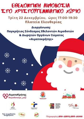Εθελοντική Αιμοδοσία θα πραγματοποιηθεί τη Τρίτη 22/12/2020 στη πλατεία Ελευθερίας και ώρες 17:00 – 19:30. Την αιμοδοσία διοργανώνει ο Παγκρήτιος Σύνδεσμος Εθελοντών Αιμοδοτών και Δωρητών Οργάνων Σώματος «Αιματοκρήτης» Την επιστημονική φροντίδα των αιμοδοτών θα έχει η κινητή μονάδα αιμοδοσίας του Νοσοκομείου ΠΑΓΝΗ.