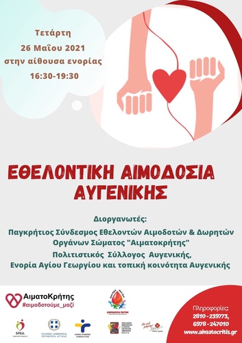 Εθελοντική Αιμοδοσία θα πραγματοποιηθεί την Τετάρτη 26/05/2021 στο χώρο της εκκλησίας της ενορίας Αγίου Γεωργίου και ώρες 16.30 έως 19.30. Την αιμοδοσία διοργανώνει ο Παγκρήτιος Σύνδεσμος Εθελοντών Αιμοδοτών και Δωρητών Οργάνων Σώματος «Αιματοκρήτης» μαζί με τον Πολιτιστικό Σύλλογο Αυγενικής , την Τοπική Κοινότητα και την Ενορία της Αυγενικής. Την επιστημονική επιμέλεια της αιμοδοσίας έχει η κινητή μονάδα αιμοδοσίας του Νοσοκομείου ΠΑΓΝΗ.
