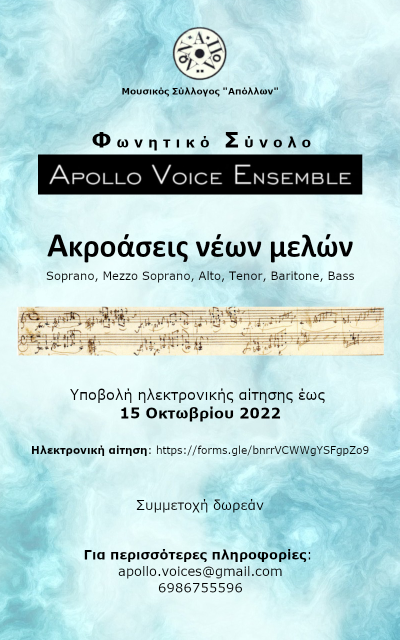 Ο Μουσικός Σύλλογος «Απόλλων» προσκαλεί σε ακρόαση νέα μέλη, ανδρικών και γυναικείων φωνών (Σοπράνο, Μέτζο Σοπράνο, Άλτο, Τενόρο, Βαρύτονο, Μπάσο), για τη στελέχωση του Φωνητικού Συνόλου “Apollo Voice Ensemble” κατά την καλλιτεχνική περίοδο 2022-2023.