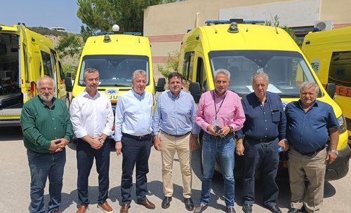 Άλλα 4 σύγχρονα ασθενοφόρα από τα 14 συνολικά παρέδωσε σήμερα ο Περιφερειάρχης Κρήτης στον Διοικητή της 7ης ΥΠΕ για τα Κέντρα Υγείας Κισσάμου, Σφακίων, Αγ. Φωτεινής και Αρκαλοχωρίου - Η χρηματοδότηση το έργου από το ΕΣΠΑ Κρήτης με προϋπολογισμό 1.148.000 χιλ. ευρώ.