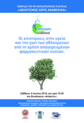 Με πρωτοβουλία της μη κερδοσκοπικής εταιρείας που εδρεύει στην Αθήνα, με την επωνυμία «ΑΘΛΗΤΙΣΜΟΣ ΧΩΡΙΣ ΑΝΑΒΟΛΙΚΑ», και σε συνεργασία με τον Δήμο Ηρακλείου, θα πραγματοποιηθεί το Σάββατο 5 Ιουνίου και ώρα 10.30, στο Ξενοδοχείο «Ατλαντίς» ¨ΗΜΕΡΙΔΑ¨ που έχει στόχο την ενημέρωση για τον αγώνα που αποβλέπει στο χτύπημα τής μάστιγας των αναβολικών.