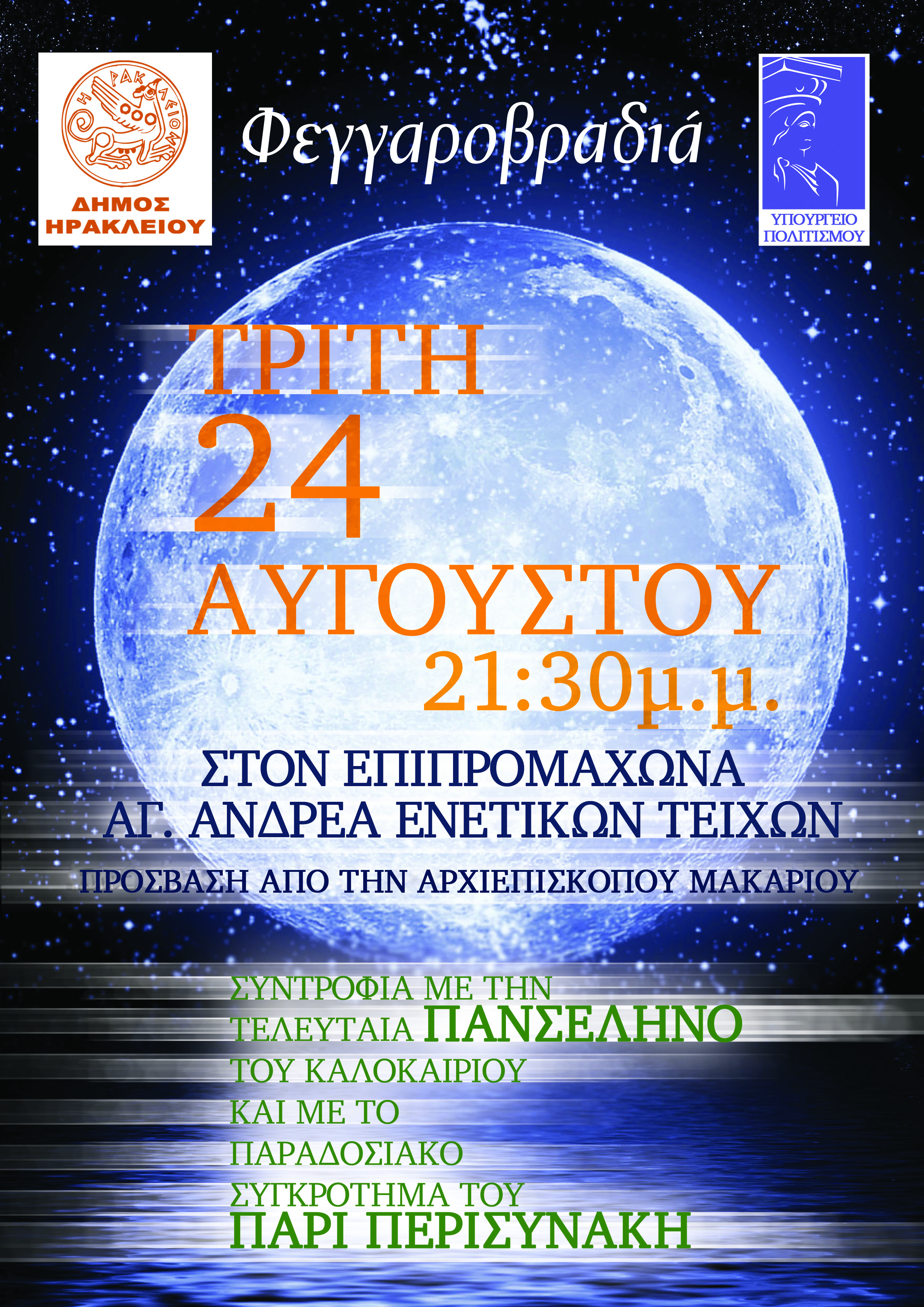 Ο Δήμαρχος Ηρακλείου κ.Γιάννης Κουράκης καλεί όλους τους Δημότες και τους επισκέπτες της πόλης να παρευρεθούν στην όμορφη αυτή εκδήλωση και να θαυμάσουν τη θέα και τα Ενετικά τείχη υπό το φως της Πανσελήνου.