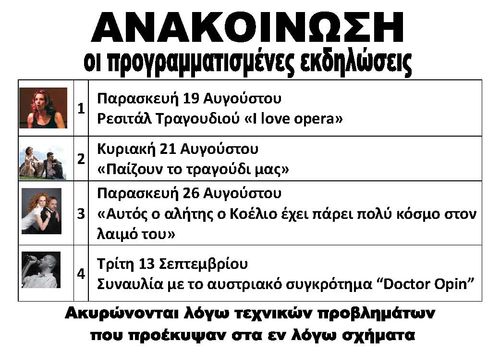 Λόγω Τεχνικών Προβλημάτων ακυρώνονται οι παρακάτω Προγραμματισμένες Εκδηλώσεις του φεστιβάλ "Ηράκλειο Καλοκαίρι 2011":