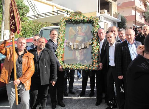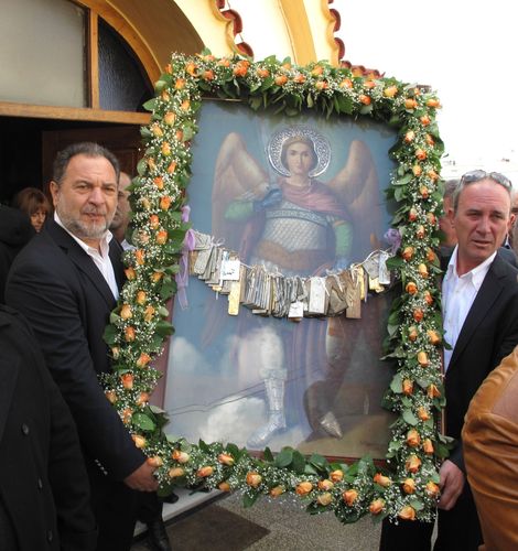 Στις φώτο ο Δήμαρχος Ηρακλείου κ. Γιάννης Κουράκης με τον Πρόεδρο του Συνδέσμου Κρεοπωλών Ν. Ηρακλείου κ. Μακριδάκη Μιχάλη κατά την λιτάνευση της εικόνας του Μιχάηλ Αρχαγγέλου