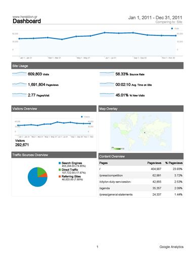 Αύξηση των επισκέψεων στο portal του Δήμου Ηρακλείου το 2011 καταγράφηκε από το google analytics. Πραγματοποιήθηκαν 609.803 επισκέψεις (516.205 το 2010) από 292.671 απόλυτα μοναδικούς επισκέπτες (241.844 το 2010). Παρακάτω κάνουμε σύγκριση με τα αντίστοιχα στοιχεία του 2010 και του 2009 που δείχνουν αύξηση των επισκέψεων κατά 18% από το 2010 και 56% από το 2009.