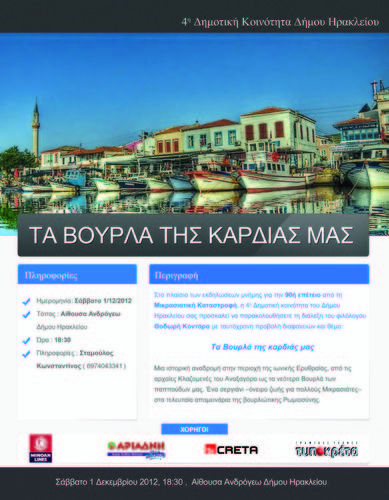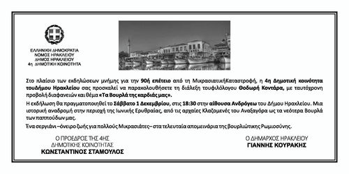 Στο πλαίσιο των εκδηλώσεων μνήμης για την 90ή επέτειο από τη Μικρασιατική Καταστροφή, η 4η Δημοτική κοινότητα του Δήμου Ηρακλείου σας προσκαλεί να παρακολουθήσετε τη διάλεξη του φιλόλογου Θοδωρή Κοντάρα με ταυτόχρονη προβολή διαφανειών και θέμα