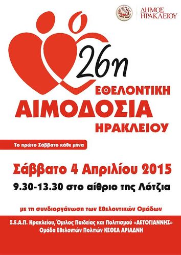 Εθελοντική Αιμοδοσία που θα πραγματοποιηθεί το ερχόμενο Σάββατο 4 Απριλίου στο Αίθριο της Λότζια από τις 9.30 το πρωί μέχρι τις 1.30 το μεσημέρι. Πρόκειται για μια κοινή προσπάθεια αιμοδοσίας εθελοντικών σωματείων και οργανώσεων του Ηρακλείου, την οποία συντονίζουν: