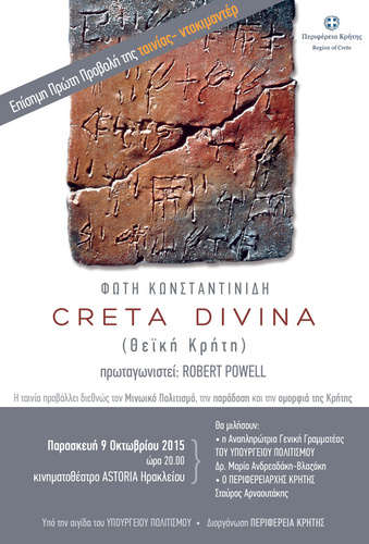 Η επίσημη πρώτη προβολή της ταινίας-ντοκιμαντέρ «Θεϊκή Κρήτη» (Creta Divina) που γυρίστηκε στην Κρήτη προβάλλοντας τον Μινωικό Πολιτισμό, την παράδοση και το φυσικό περιβάλλον του νησιού θα πραγματοποιηθεί την Παρασκευή 9 Οκτωβρίου 2015 στις 8 το βράδυ στο κινηματοθέατρο Αστόρια. Η ταινία σε σκηνοθεσία-σενάριο του Φώτη Κωνσταντινίδη γυρίστηκε με την στήριξη της Περιφέρειας Κρήτης και πρωταγωνιστεί ο διεθνώς γνωστός Άγγλος ηθοποιός Robert Powell το όνομα του οποίου χαράχτηκε στην ιστορία της 7ης τέχνης ενσαρκώνοντας τον Ιησού Χριστό στην ομώνυμη ταινία του Ιταλού σκηνοθέτη Φράνκο Τζεφιρέλι. Η εκδήλωση-προβολή ταινίας τη Παρασκευή θα έχει ελεύθερη είσοδο σε φορείς-πολίτες και θα μιλήσουν η αναπληρώτρια γενική γραμματέας του Υπουργείου Πολιτισμού Δρ. Μαρία Ανδρεαδάκη-Βλαζάκη και ο Περιφερειάρχης Κρήτης Σταύρος Αρναουτάκης.