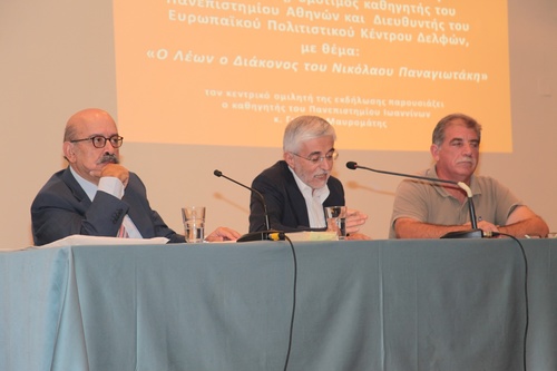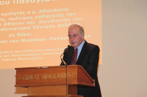 Για τον επιφανή επιστήμονα και δάσκαλο, που προώθησε σημαντικά τις Βυζαντινές και τις Κρητολογικές σπουδές, στον τόπο μας, μίλησε ο κ. Αθανάσιος Μαρκόπουλος, ομότιμος καθηγητής Πανεπιστημίου Αθηνών και Διευθυντής του Ευρωπαϊκού Πολιτιστικού Κέντρου Δελφών, ο οποίος ανέπτυξε το θέμα: «Ο Λέων ο Διάκονος του Νικόλαου Παναγιωτάκη».