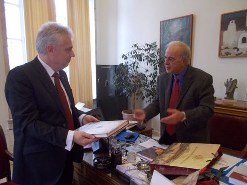 Ο κ. Λαμπρινός πρόσφερε στον Ρουμάνο Πρέσβη τον τόμο με το έργο «Κρητικός Πόλεμος» της Χρυσούλας Τζομπανάκη μεταφρασμένο στα αγγλικά.