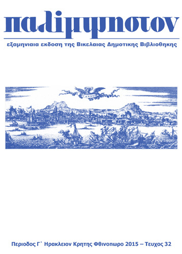 Από τις εκδόσεις της Βικελαίας Δημοτικής Βιβλιοθήκης κυκλοφόρησε το 32ο τεύχος του περιοδικού Παλίμψηστον. Μία έκδοση με ενδιαφέρουσες συνομιλίες, μεταφράσεις και ιστορικά στοιχεία που αφορούν στην Κρήτη από την περίοδο της ενετοκρατίας μέχρι και τις αρχές του 20ου αιώνα. Το περιοδικό διατίθεται από το βιβλιοπωλείο των εκδόσεων του Δήμου Ηρακλείου στο Κτίριο Αχτάρικα, και από τα βιβλιοπωλεία της πόλης μας.