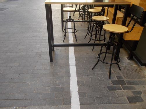 Συνεργεία των τεχνικών υπηρεσιών του Δήμου, αρχικά πραγματοποιούν μέτρηση του χώρου και στη συνέχεια χαράσσουν πρώτα με αστάρι, στη συνέχεια άσπρο χρώμα και τέλος με έντονο κίτρινο χρώμα γραμμές έτσι ώστε καθίσματα και τραπέζια να είναι εντός του ορίου.