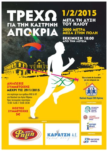Τρέχω για την Καστρινή αποκριά. 1ος φιλανθρωπικός αγώνας δρόμου για την Έναρξη της Καστρινής αποκριάς. Διανύουμε 3000 μέτρα μετά την δύση του ήλιου μέσα στο ιστορικό Ηράκλειο και βοηθάμε να κτιστεί το παιδικό χωρίο SOS Κρήτης.