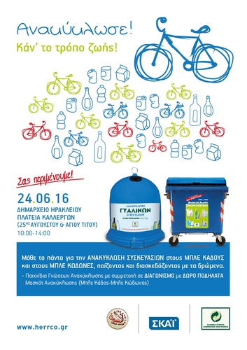 Με κεντρικό σύνθημα: «Ανακύκλωσε – Κάν’ το τρόπο ζωής», ο Δήμος Ηρακλείου, σε συνεργασία με την Ελληνική Εταιρεία Αξιοποίησης Ανακύκλωσης και τον Όμιλο ΣΚΑΙ, διοργανώνουν δράση ενημέρωσης και ευαισθητοποίησης, την Παρασκευή 24 Ιουνίου 2016, από τις 10 το πρωί έως τις 2 το μεσημέρι, στο αίθριο της Λότζια.