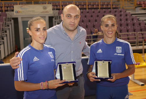 Ο Αντιδήμαρχος Αθλητισμού κ. Κώστας Βαρδαβάς υποδέχθηκε τις αδελφές Βασιλείου στο κλειστό και τους απένειμε τιμητικές πλακέτες εκ μέρους του Δήμου Ηρακλείου για τη συνολική προσφορά τους στον αθλητισμό :