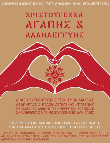 Οι δράσεις που οργανώνει ο Δήμος Ηρακλείου ( Αντιδημαρχία Κοινωνικής Πολιτικής) και οι Δημοτικές Κοινότητες της πόλης καθώς και οι Κοινότητες των Βασιλειών και της Αλικαρνασσού με τίτλο "ΧΡΙΣΤΟΥΓΕΝΝΑ ΑΓΑΠΗΣ ΚΑΙ ΑΛΛΗΛΕΓΓΥΗΣ" συνεχίζονται και αυτή την εβδομάδα.